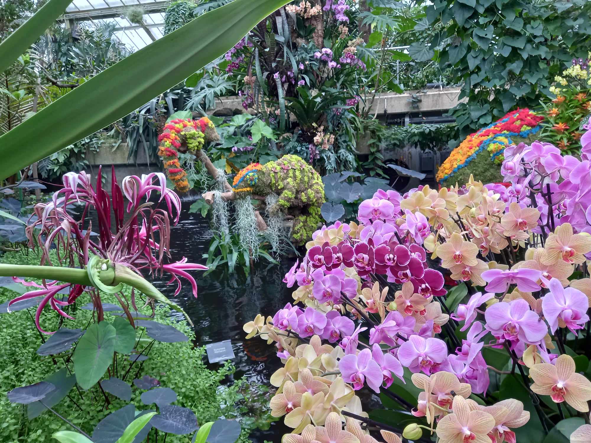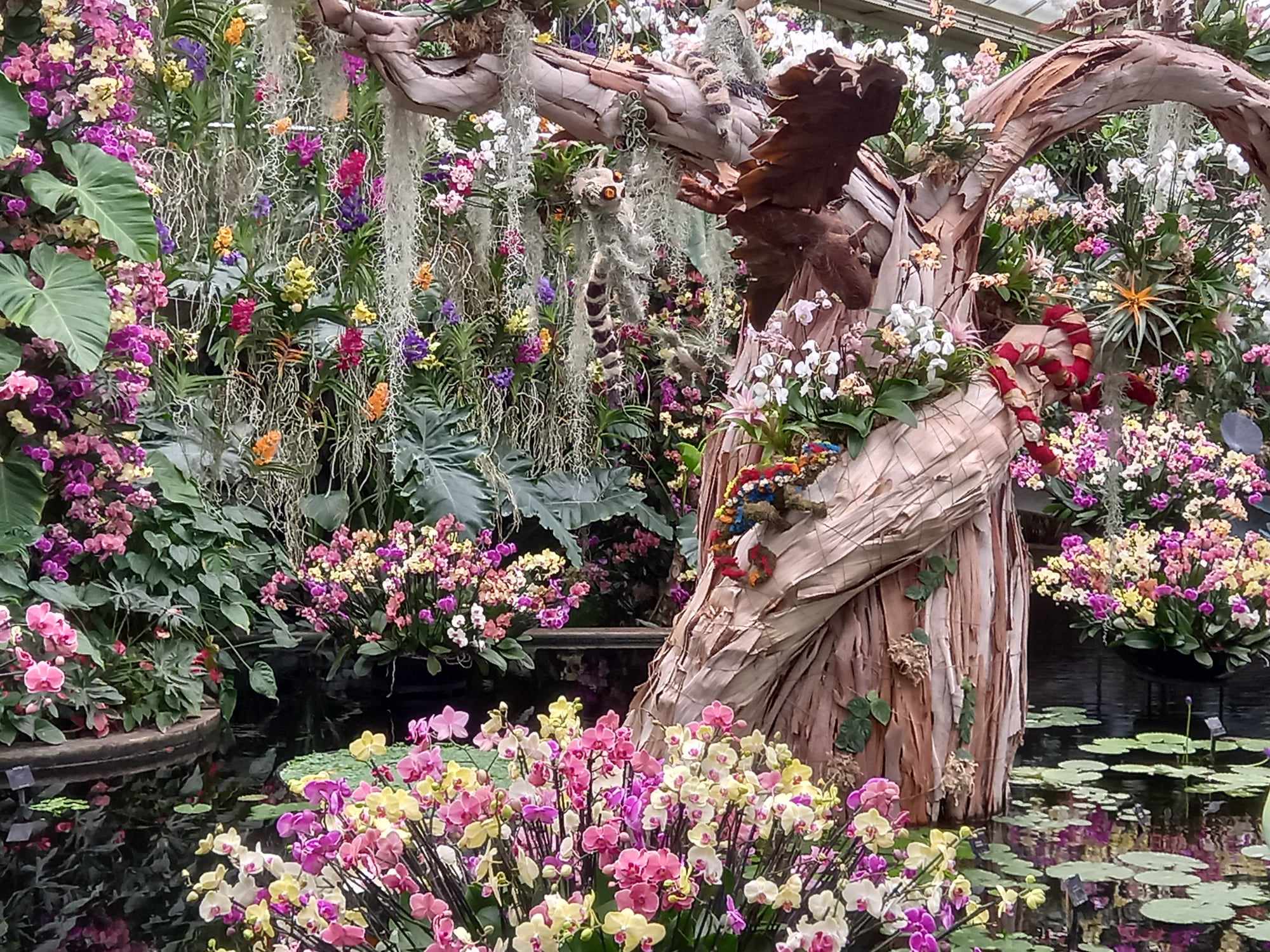 V systému skleníků s názvem Princess of Wales Conservatory připravili výstavu orchidejí motivovanou právě madagaskarskou přírodou. Hned u vstupu sedí na zídce tři roztomilí lemuři. Neutečou. Jsou vyrobeni z přírodního materiálu, stejně tak jako ostatní zvířata – želvy, chameleoni nebo huňáč s dlouhým ocasem a velkýma očima, který v noci chroustá hmyz nebo baští sladké plody – vzácná madagaskarská noční poloopice ksukol. Nejvíce to potěší děti, že mohou mezi kvetoucími rostlinami tyhle živočichy najít.
