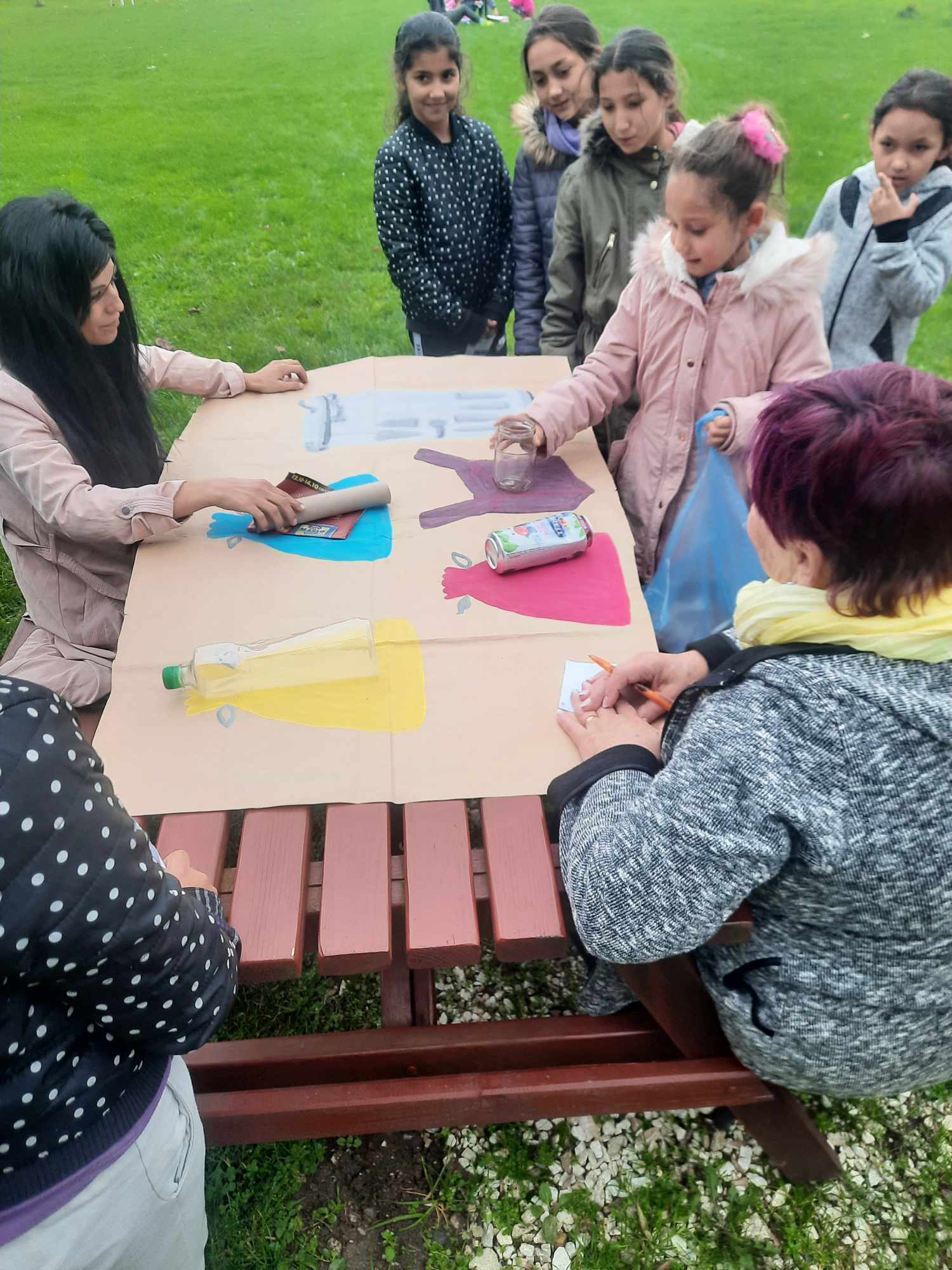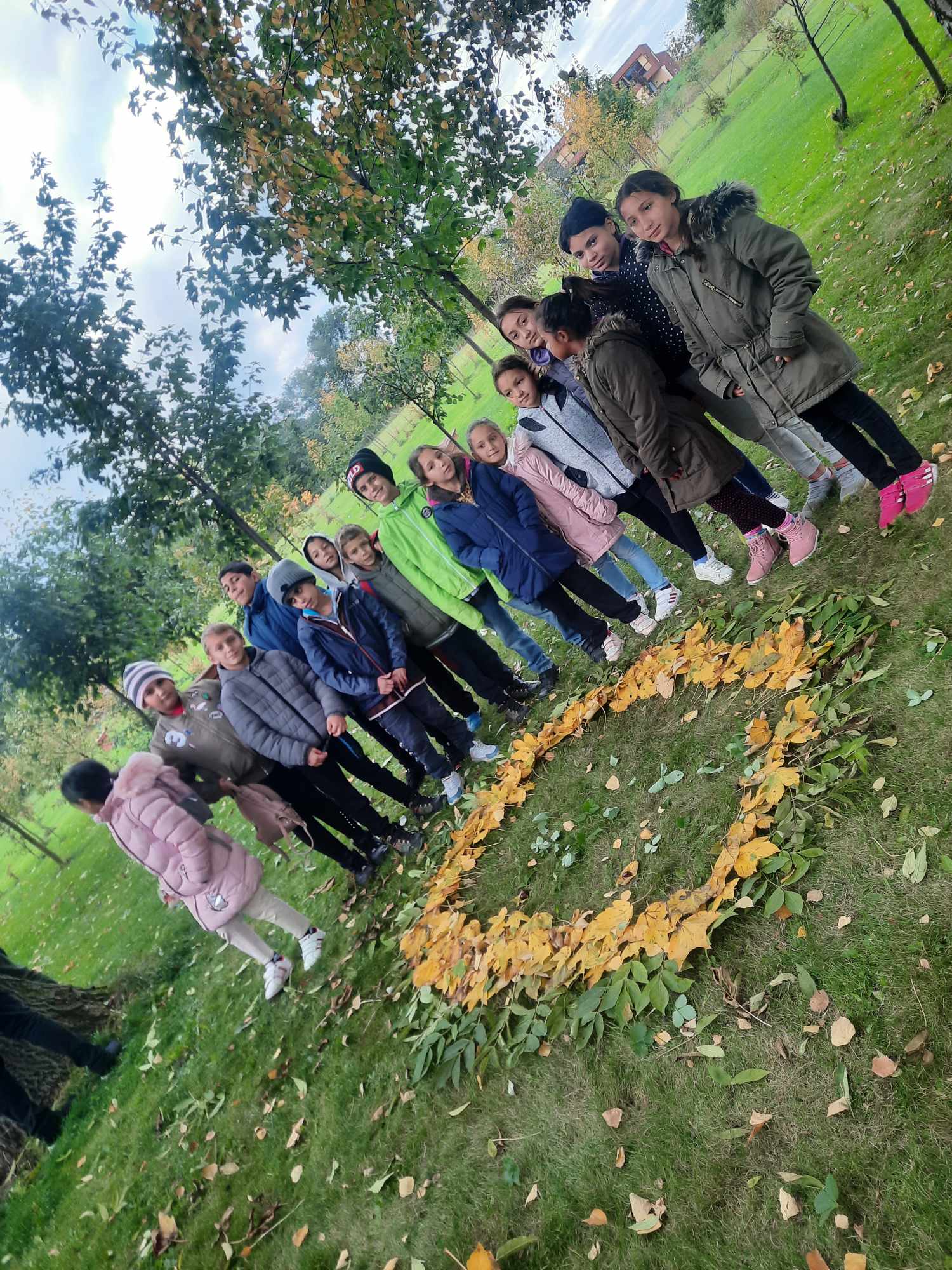 Když se děti posilnily, rozdělily se do tří skupin a našly si krásně vybarvené listy, aby z nich společně vytvořily v trávě obrazy.